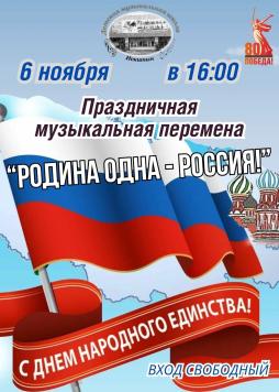 Дорогие ребята, уважаемые родители! Приглашаем вас 6 ноября в 16-00 на праздничную музыкальную перемену "Родина одна- Россия!", посвящённую Дню народного единства.