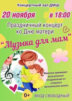 Дорогие ребята, уважаемые родители! Приглашаем вас 20 ноября в 18-00 на праздничный концерт "Музыка для мам", посвящённый Дню матери.